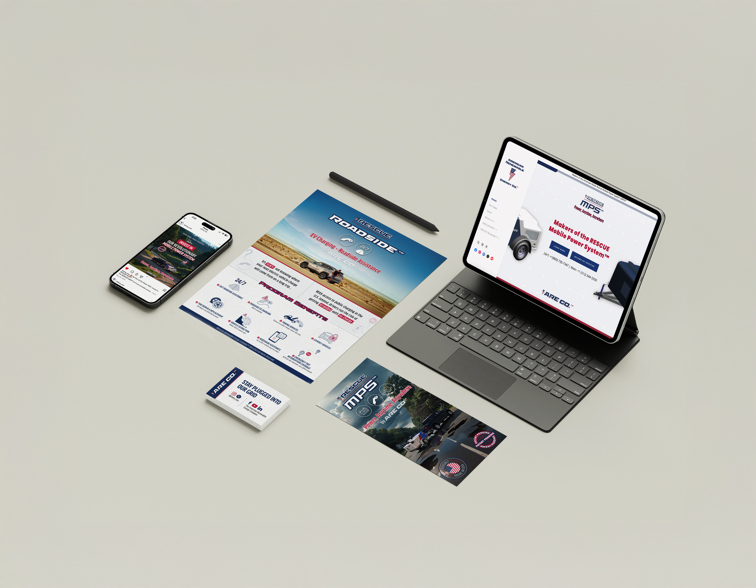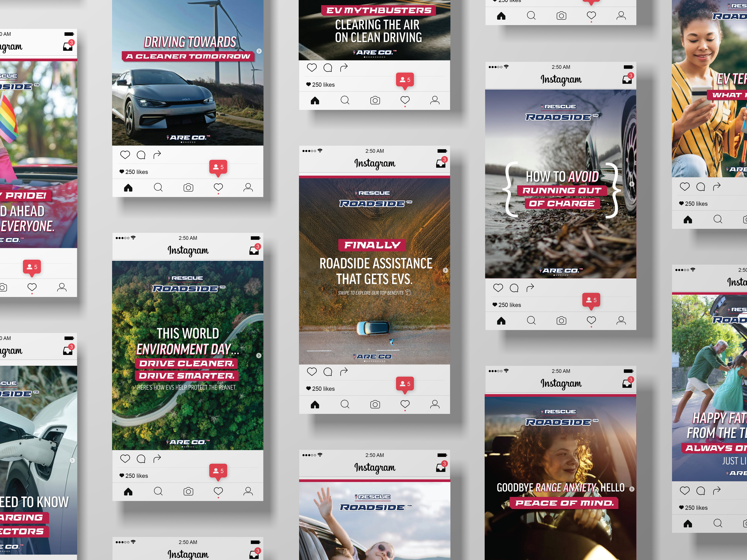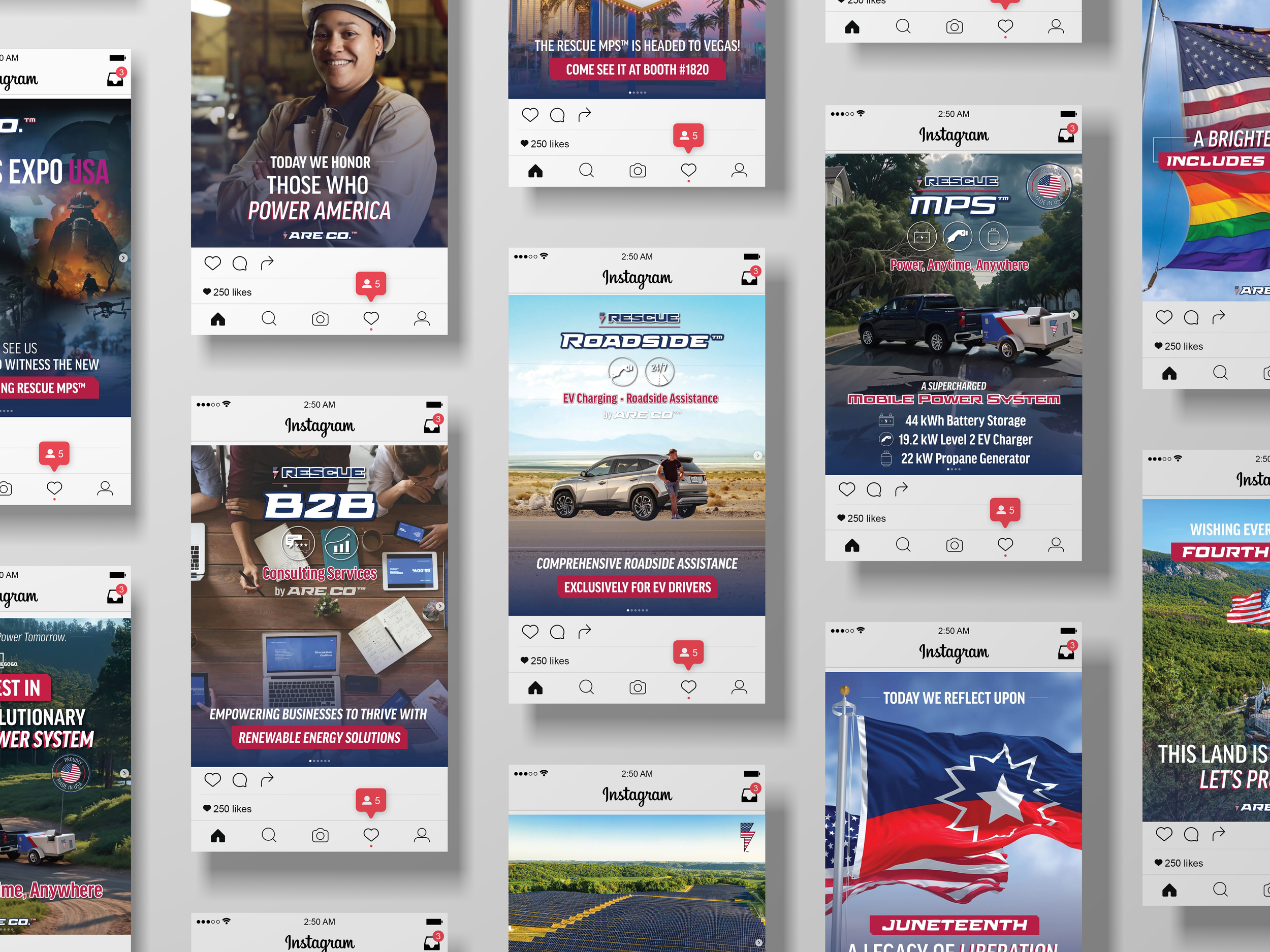 One of my first tasks at the company was to create logos and brand identities for three of ARE CO.’s sub-brands, RESCUE MPS, RESCUE Roadside, and RESCUE B2B. My goal was to create distinctive sub-brands that felt deeply connected to the core brand of the company. By tying in the lightning bolt symbol, brand typeface, and brand color palette each sub-brands feel connected yet distinctive. The circular icons showcased across each of the logos highlights their individuality while still maintaining their connectivity. I created a primary and secondary logo for each and outlined in the brand guide specific instructions on how/when each should be used.